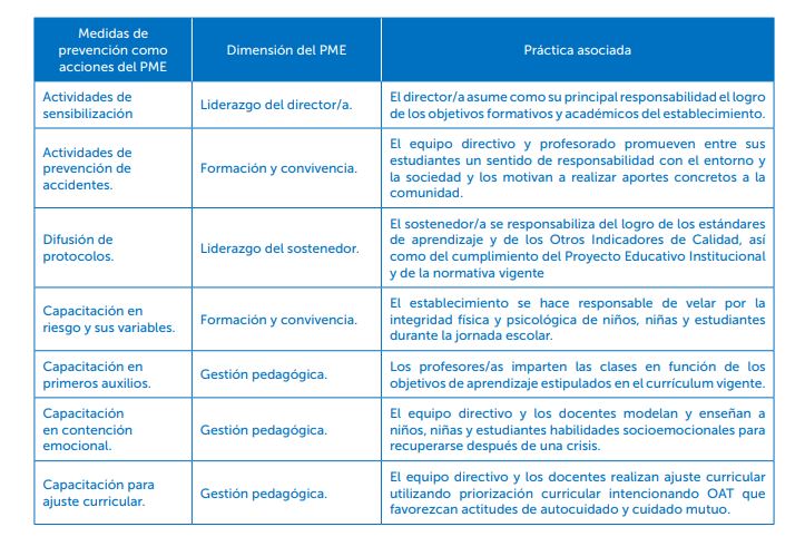 Los desafíos de la educación en el siglo XXI exigen un esfuerzo intencionado para educar y cultivar tanto conocimientos como habilidades. Por ello es central el resguardo y protección de las comunidades educativas ante distintas situaciones de orden natural o social que puedan afectar la continuidad de los procesos educativos. En este sentido, la educación promueve una ciudadanía activa entre los integrantes de la comunidad educativa la que favorece el cuidado personal, el respeto por las personas y el entorno natural como pilares fundamentales para construir una ética centrada en el bien común y los cuidados colectivos. El proceso educativo contribuye, además, a la comprensión de fenómenos científicos relacionados con la adaptación frente a los efectos del cambio climático, la pérdida de biodiversidad, la contaminación y el desarrollo de actitudes que favorecen el bienestar personal y social. En este contexto, el Ministerio de Educación pone a disposición de las comunidades educativas la actualización del Manual para la elaboración del Plan integral de seguridad educativa (PISE). El objetivo principal es ofrecer ejemplos de acciones y prácticas recopiladas de jardines infantiles, salas cuna, escuelas y liceos de nuestro país que han enfrentado diversas emergencias. Su propósito es proporcionar pautas y herramientas para la elaboración y/o actualización de dicho Plan. EL PISE, por su parte, es la herramienta que deben tener las comunidades educativas para la gestión de riesgos, buscando reforzar las condiciones de seguridad instalando una metodología de trabajo permanente en cada establecimiento educacional. Promover una 1Decreto N°283. MINEDUC, 2001. cultura y una ética del cuidado y la prevención de riesgos que atenten contra la integridad física, social y psicológica es parte de la tarea educativa. Así, el PISE es un instrumento de prevención y de formación. El presente manual actualiza conceptos en función de la promulgación de la Ley 21.364 de 2021 del Ministerio del Interior y Seguridad Pública que establece el Sistema nacional de prevención y respuesta ante desastres (SINAPRED), y crea el Servicio nacional de prevención y respuesta ante desastres (SENAPRED), homologándose a la normativa nacional. Las orientaciones descritas en el manual están basadas en políticas nacionales e internacionales, adaptadas a los contextos de la educación parvularia y escolar. Participaron en esta actualización: la Subsecretaría de Educación, a través de la Unidad nacional de gestión del riesgo de desastre; la División de Educación General DEG, a través de la Unidad de convivencia y seguridad escolar; la Subsecretaría de educación parvularia y la Superintendencia de educación. Contó con la colaboración de SENAPRED y fue retroalimentada por áreas internas de la División de Educación General DEG: Trayectoria educativa, Aprendizaje para el siglo XXI, Liderazgo y gestión para la mejora educativa. También, recogió información desde las secretarías regionales ministeriales de educación, servicios locales de educación, instituciones públicas y privadas que conforman la Comisión nacional de seguridad escolar1 y oficinas regionales de SENAPRED